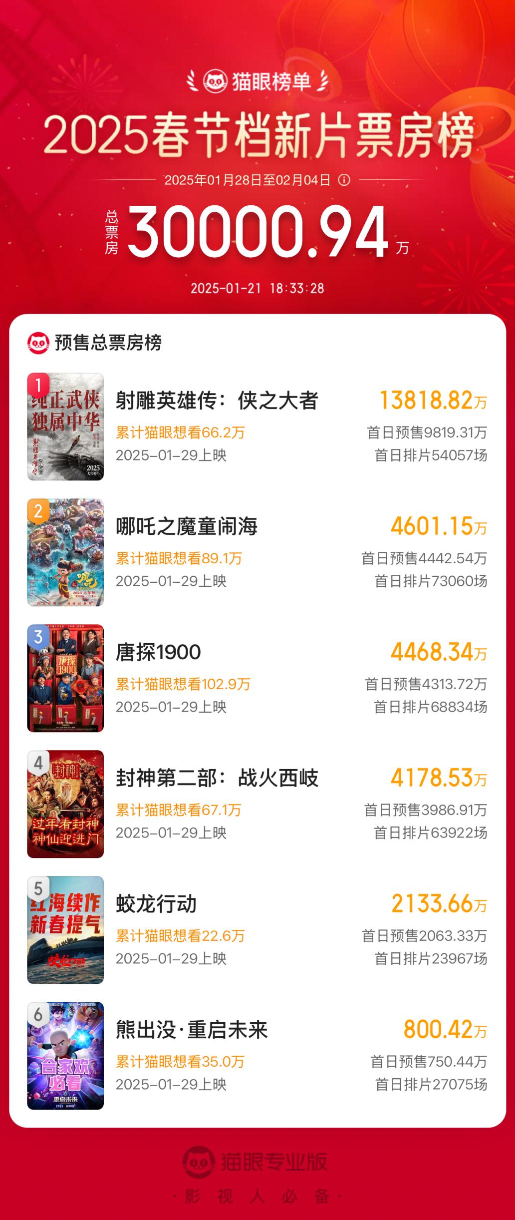据猫眼专业版数据,2025年1月21日18时33分,2025年春节档新片预售总票房破3亿!《射雕英雄传:侠之大者》《哪吒之魔童闹海》《唐探1900》分列2025年春节档新片预售票房榜前三。